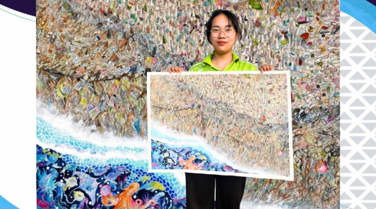 นางสาวจันทร์จิรา แหนบคำ นักเรียนชั้นมัธยมศึกษาปีที่ 5/7 ในโอกาสที่ได้รับรางวัล ร่วมแสดงผลงาน ในการประกวดศิลปกรรม ปตท. ครั้งที่ 40 ภายใต้หัวข้อ “เติบโต สมดุล ยั่งยืน” โดยผลงานที่ส่งเข้าประกวดมีชื่อว่า